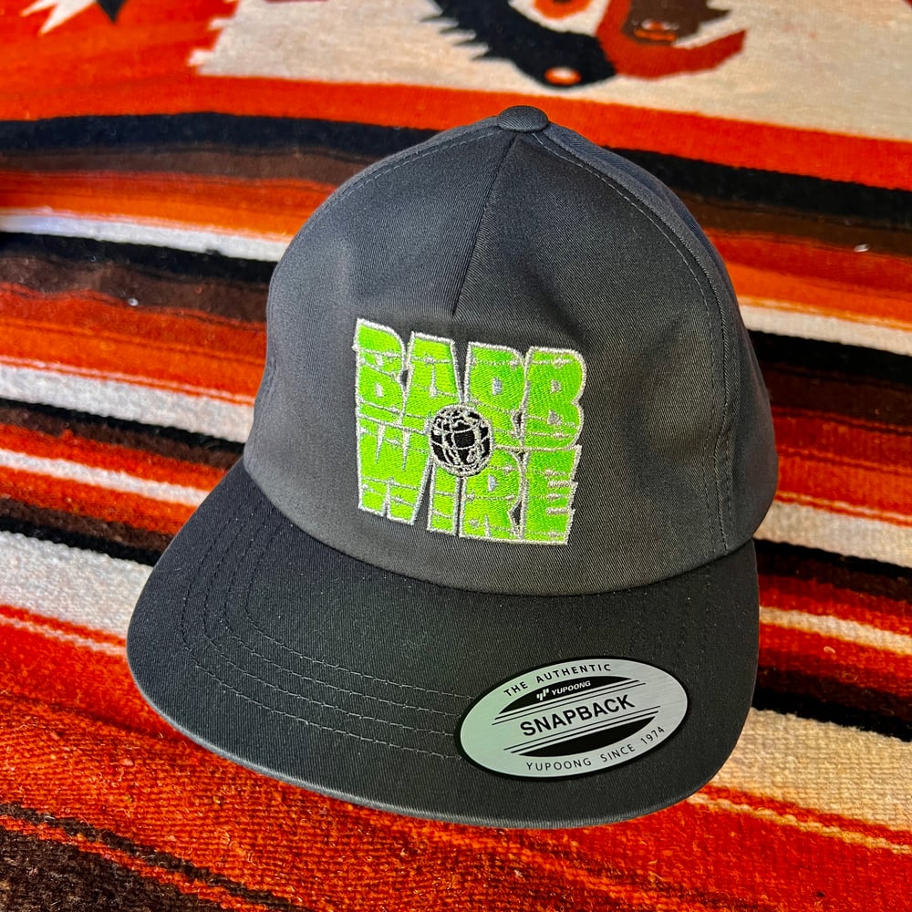 Features metallic silver & neon green embroidery on front + grey embroidery on back script. Grey Yupoong 6502 Classic snapback.